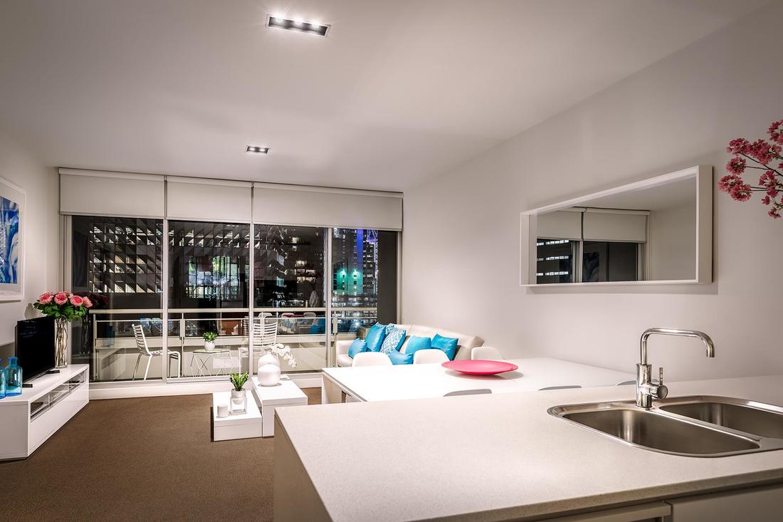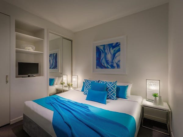 These rooms are fitted out to an exceptional standard in a modern contemporary style allowing you to enjoy city living right in the heart of Melbourne. Sleeping four to six people, this popular room style offers two King or Twin bedrooms with an ensuite bathroom. Also, the living and dining areas are spacious and can accommodate extra guests on the sofa bed. Plus, the fully equipped modern kitchen includes an oven, a microwave and a dishwasher.